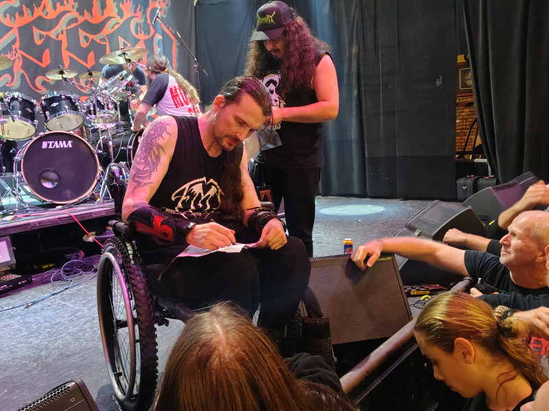 Vyhňa pekiel odetá v rýdzo červených farbách, štvorica hudobníkov maximálne verne reprodukuje evergreeny ako “Pentagram“, “Twisted Minds“, “Fallen Angel“, “Death Metal“ a zo svojho trónu na štyroch kolesách celému tomuto ohnivému rituálu spoľahlivo podkuruje nezlomná a mimoriadne silná duša frontmana Jeffa Becerru. Ak sa niekedy bohužiaľ dostanete do bodu, kedy si poviete „nemôžem, nedá sa, kašlem na to“, okamžite si spomeňte na tohto pána, ktorý na vozíku precestoval krížom krážom celý svet, pevne ovládol nejedno pódium a po vyčerpávajúcom 80 minútovom vystúpení ešte hodný čas celý prepotený rozdával autogramy na všetko, čo mu strčil lojálny fanda pod ruku.