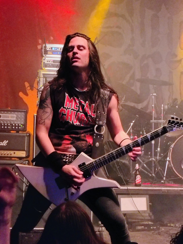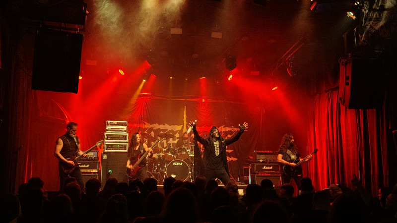 ...ich nasledujúci susedia SUICIDAL ANGELS na to doplatili krátením toho svojho. Kvarteto hralo v našej republike túto sezónu hneď dvakrát, v rovnakom košickom klube si dokonca v marci struhlo rovno headlinerskú pozíciu. Preto som asi máličko nepochopil potrebu thrash metalovej formácie do nás opätovne napáliť totožné skladby, žiaľ ešte ukrátené o bežne hrávanú petardu “Crypts of Madness“. Došlo aspoň na výmenu v chronológií, kde štart tentokrát odbila fantastická “Capital of War“ a až na mierne utopený vokál frontmana Nicka išlo všetko ako po masle. Nový sólový gitarista Stam sa predviedol vo výbornom svetle a na kapele je vidno, že rokmi zrejú ako kvalitné víno.